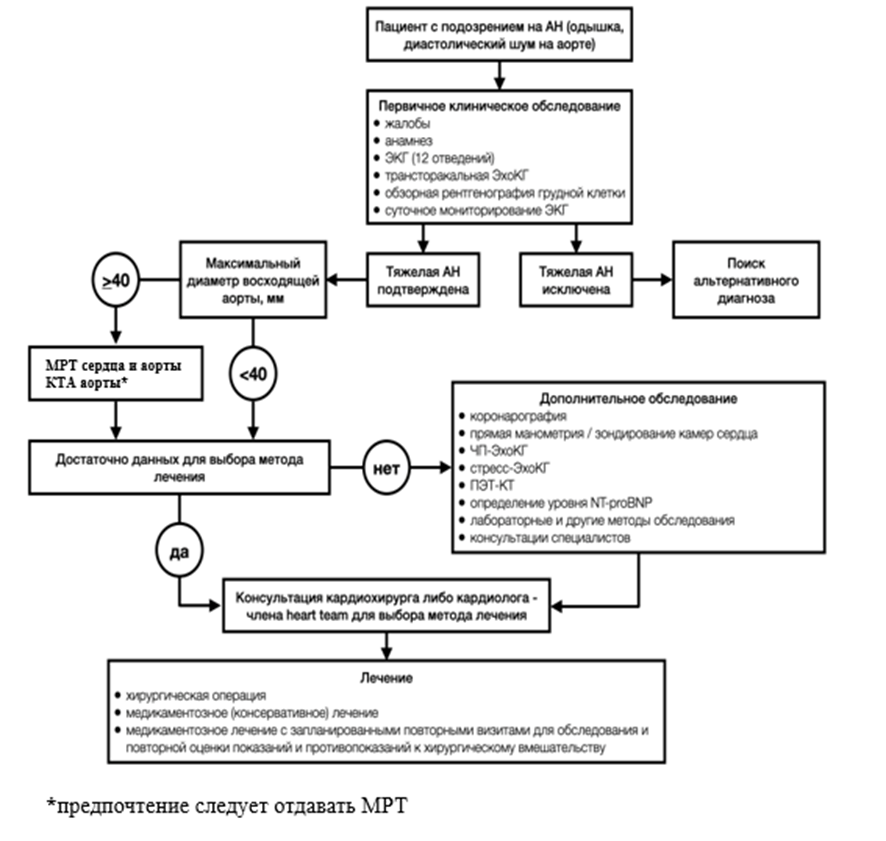 • При выявлении расширения корня и/или восходящего отдела аорты >40 мм у пациентов с АН, в особенности у пациентов с дисплазиями соединительной ткани (синдромы Марфана, Элерса-Данло, Лойеса-Дитца и др.), с врожденными аномалиями АК, коарктацией аорты, дефектом межжелудочковой перегородки рекомендуется выполнение КТА аорты с контрастированием с синхронизацией с ЭКГ  или МРТ сердца и магистральных сосудов с контрастированием для верификации размеров грудной аорты на разных уровнях, уточнения состояния ее стенки, исключения областей расслоений, интрамуральных гематом и/или аневризматических расширений, а также в случае оперативного лечения при необходимости в пред- и/или послеоперационном периоде [13, 34, 35, 36].