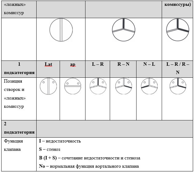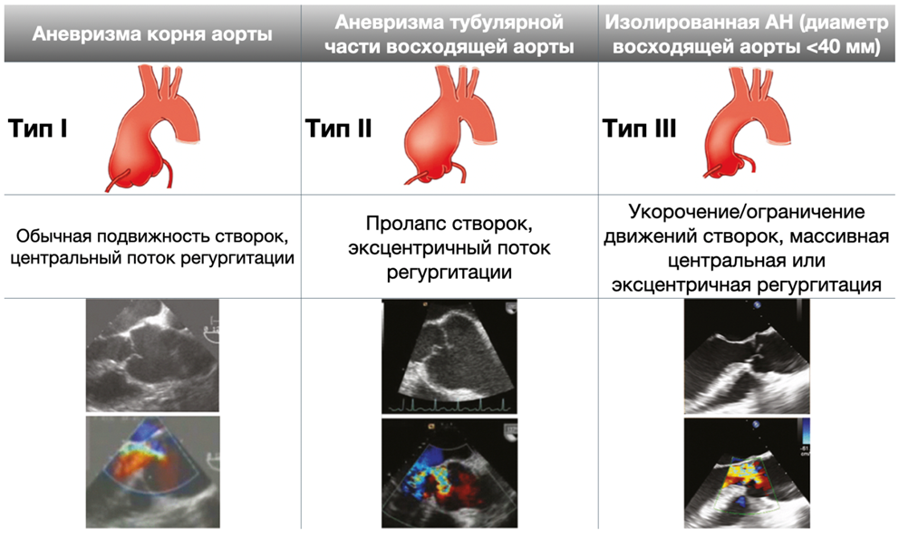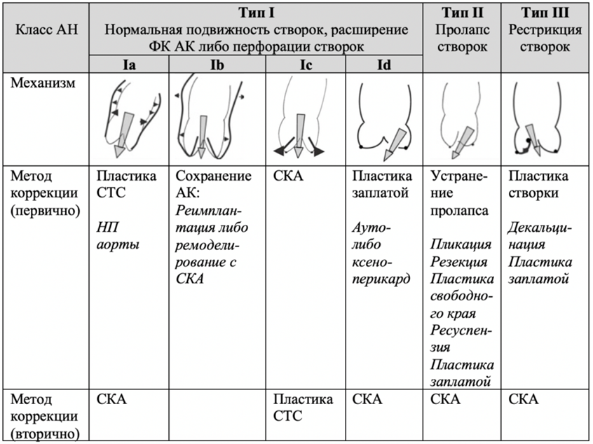 Данная классификация предпочтительнее при постановке диагноза, использование классификации по цифровым степеням регургитации (1, 2, 3, 4) не рекомендуется [11, 12, 13, 14, 15]. По механизму формирования выделяют 3 типа АН: первый (нормальные створки АК, нарушенная коаптация вследствие расширения ВА, центральная струя регургитации), второй (пролапс створок АК и эксцентричный поток регургитации) и третий (деформация и ретракция створок АК с формированием центрального либо эксцентричного потока регургитации). L. de Kerchove и G. El Khoury расширили данную классификацию с позиции выбора метода коррекции АН (таблица ПБ-2, Приложение Б) [11, 16].