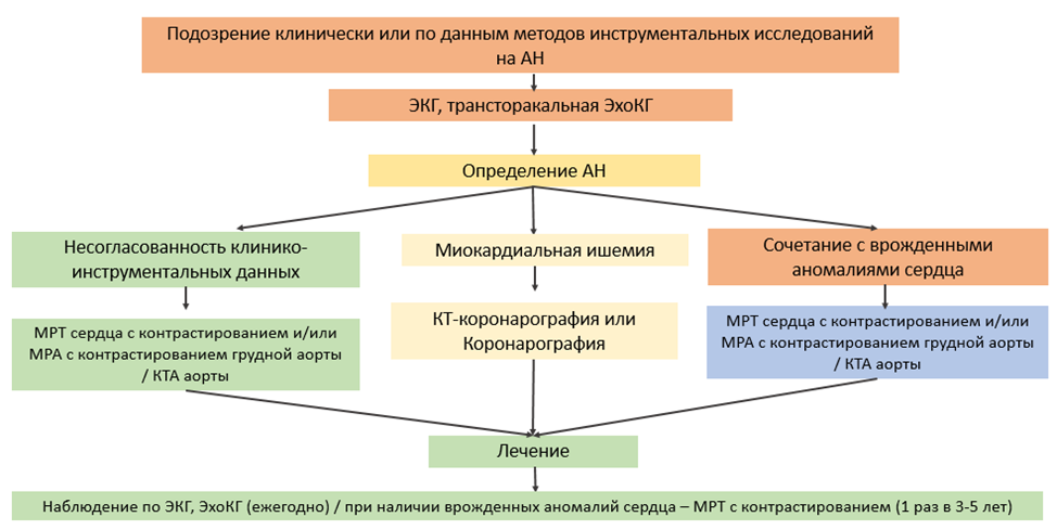 • Рекомендуется рассмотреть возможность выполнения позитронно-эмиссионной томографии миокарда  с целью получения информации о структуре и функции сердца пациентам с подозрением на АН только в случае неубедительных или противоречивых результатов МРТ и при отсутствии противопоказаний, а также в случае оперативного лечения при необходимости в пред- и/или послеоперационном периоде [12].
