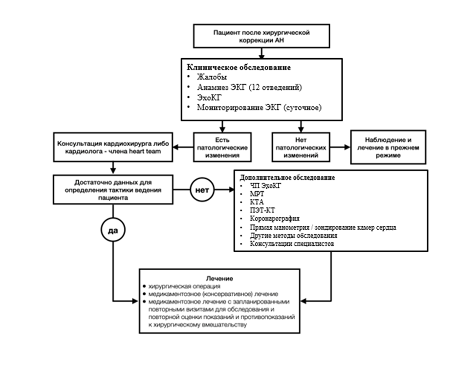 • Рекомендуется выполнение холтеровского мониторирования ЭКГ сердечного ритма пациентам с АН и сопутствующими нарушениями ритма и/или проводимости с целью выявления последних, и при необходимости подбора терапии, а также в случае оперативного лечения при необходимости пред-и/или послеоперационном периоде [7, 13, 17].