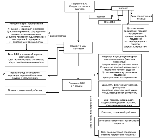 Основой качественной помощи больным БАС является регулярное наблюдение со всесторонней оценкой состояния пациента и совместное с пациентом и его семьей планирование предстоящих вмешательств, назначений и процедур. Для оценки качества оказания помощи проводится анализ медицинской документации с фиксированием кратности основных показателей и сопоставлением этой кратности с целевыми значениями.
