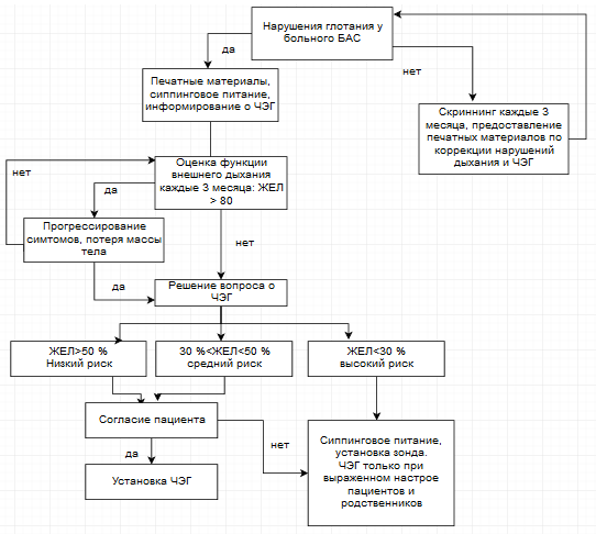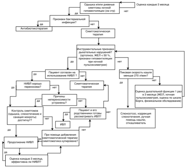 Таким образом, пациент, у которого на любой стадии заболевания появляются показания для установки гастростомы (снижение массы тела на 10 % и/или невозможность полноценно накормить через рот) или показания к вспомогательной вентиляции легких (ЖЕЛ ниже 50 % или ЖЕЛ ниже 80 % в сочетании с симптомами гиповентиляции: ортопноэ, одышка при нагрузке, избыточная дневная сонливость), переходит на 4 стадию заболевания.