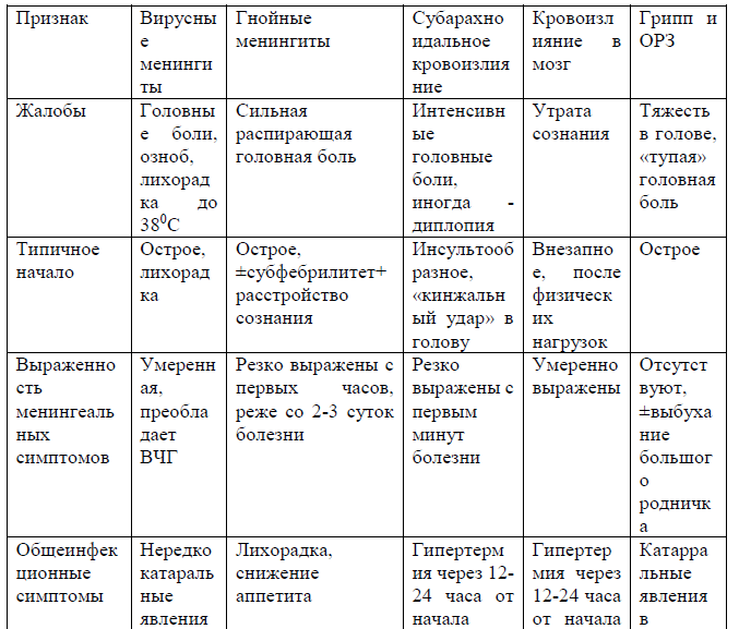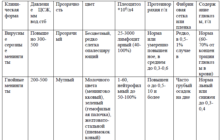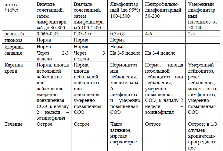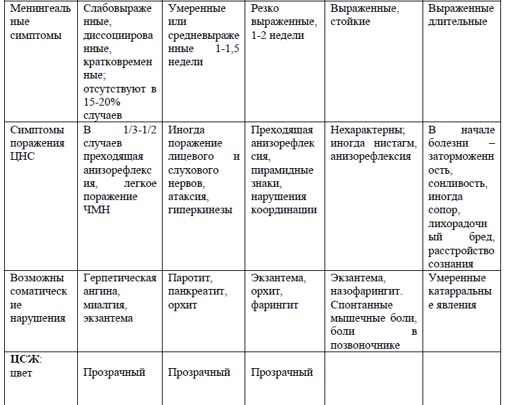 По степени выраженности менингеальных симптомов и изменениям в цереброспинальной жидкости целесообразно выделять начальный менингит (цитоз от 15 до 50х106/л) и выраженный (при высоком плеоцитозе).