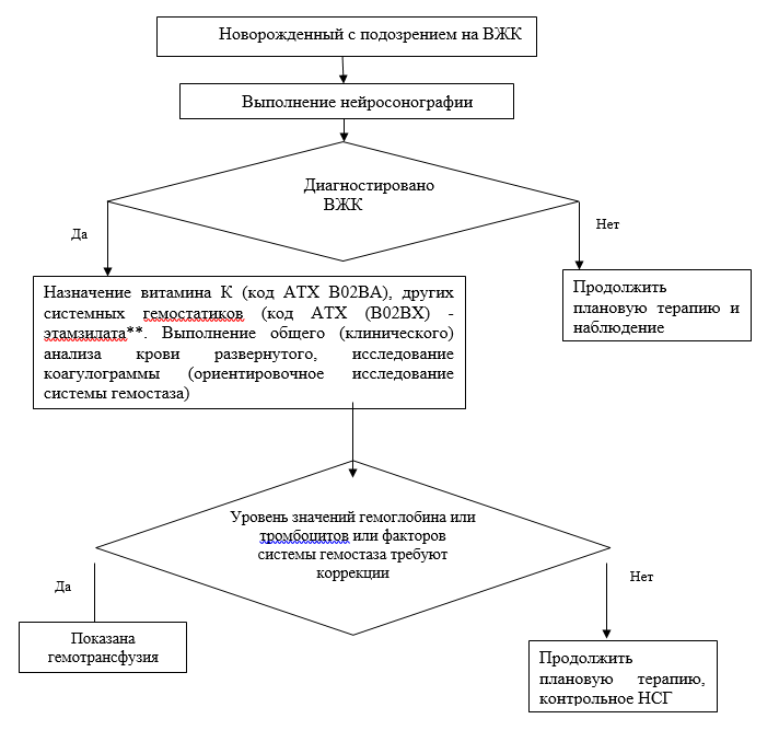 Комментарии: к факторам риска относятся: отсутствие антенатальной кортикостероидной терапии, хориоамнионит, многоплодная беременность, гестационный возраст 32 недели и менее, масса тела при рождении 1500 граммов и менее, оценка по шкале Апгар 5 баллов и менее, роды через естественные родовые пути при сроке гестации 32 недели и менее, снижение температуры тела 35С0 и менее, транспортировка в другой стационар, потребность в искусственной вентиляции легких, потребность в инотропной терапии, коагулопатия, тромбоцитопения, метаболический ацидоз, потребность в использовании растворов электролитов (код АТХ В05ХА) – натрия гидрокарбоната**.