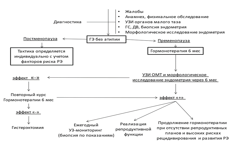 Терапия ГЭ включает консервативное (гормональное) и оперативное лечение. Выбор тактики ведения ГЭ зависит от патолого-анатомического заключения, возраста пациентки, ее репродуктивных планов, наличия факторов риска ГЭ и сопутствующей гинекологической и экстрагенитальной патологии [25], [26], [27]. Цель терапии ГЭ состоит в купировании АМК, профилактике рецидивов ГЭ и развития РЭ.
