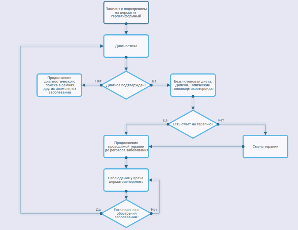 Рекомендуется безглютеновая диета пациентам с герпетиформным дерматитом вне зависимости от наличия высыпаний с целью прекращения контакта с антигеном, индуцирующим развитие аутоиммунных реакций [16–18].