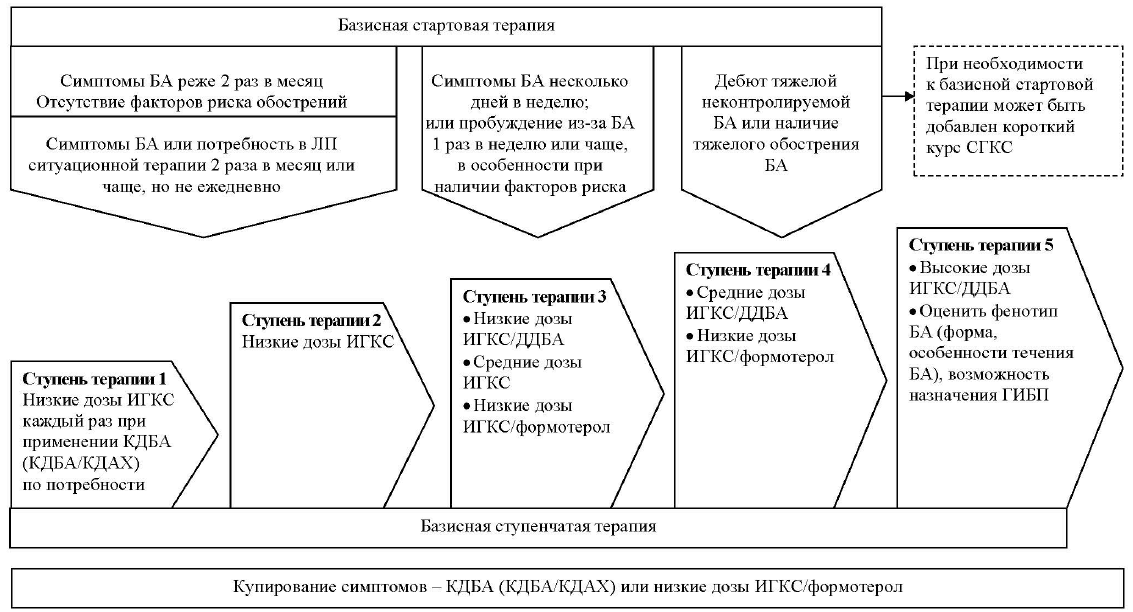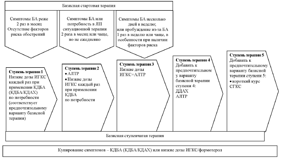 достижение контроля БА, применяется для регулярной терапии и основано на ступенчатом подходе к лечению с возможностью увеличения (увеличение ступени) или уменьшения (уменьшение ступени) объема терапии при необходимости;
