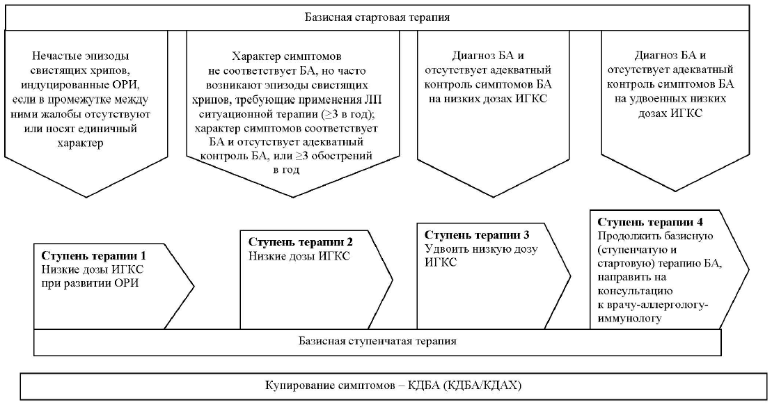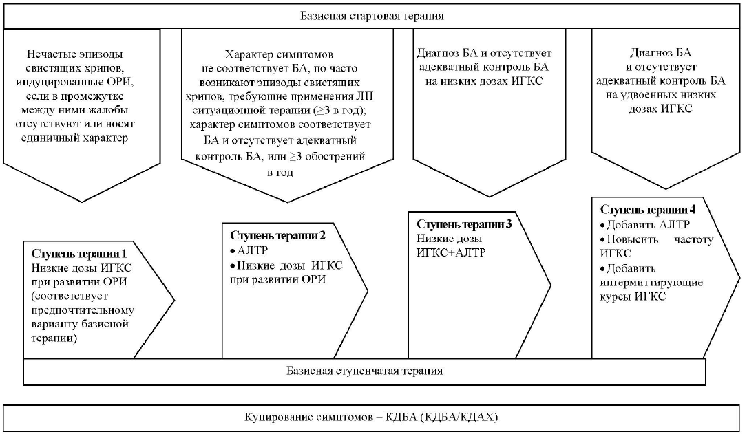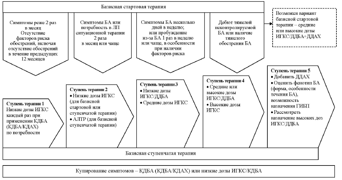 * На ступенях терапии 1–4 возможен вариант терапии с добавлением АСИТ. На ступенях терапии 3–5 возможен вариант терапии с добавлением АЛТР. На ступени терапии 4 возможен вариант терапии с добавлением ДДАХ. На ступени терапии 5 возможен вариант терапии с добавлением короткого курса СГКС.