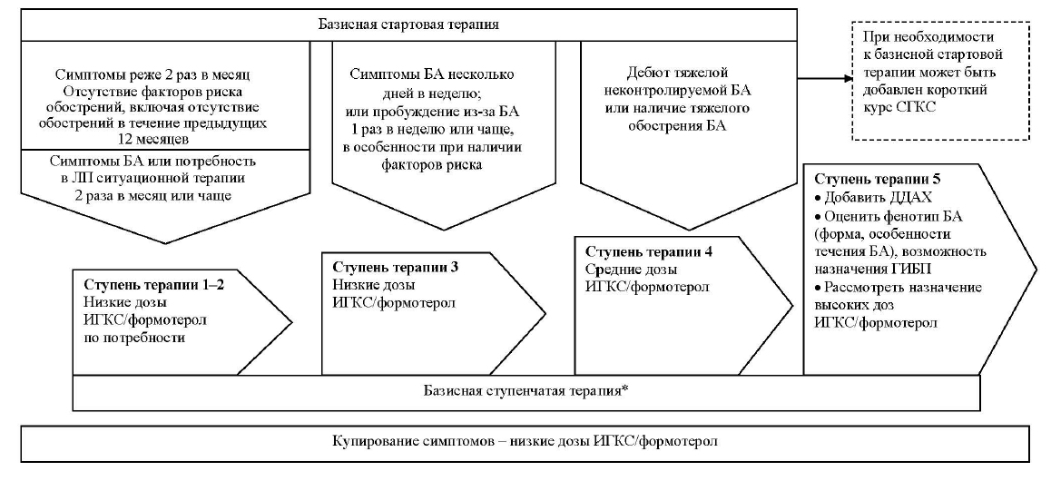 базисная стартовая терапия низкими дозами ИГКС/формотерол и по потребности низкие дозы ИГКС/формотерол