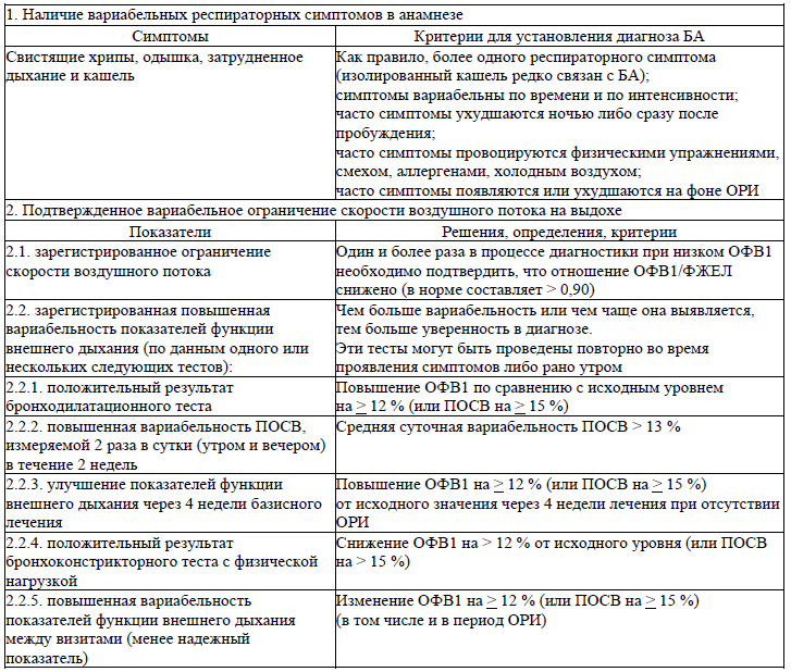 Классификация БА по степени тяжести и течению (по клиническим признакам до начала лечения) указана в приложении 1. Степень тяжести и течение БА определяются по выраженности симптомов, наличию (степени) бронхообструкции (показатели ОФВ1 или ПОСВ) и бронхореактивности (суточной вариабельности показателей ОФВ1 или ПОСВ);