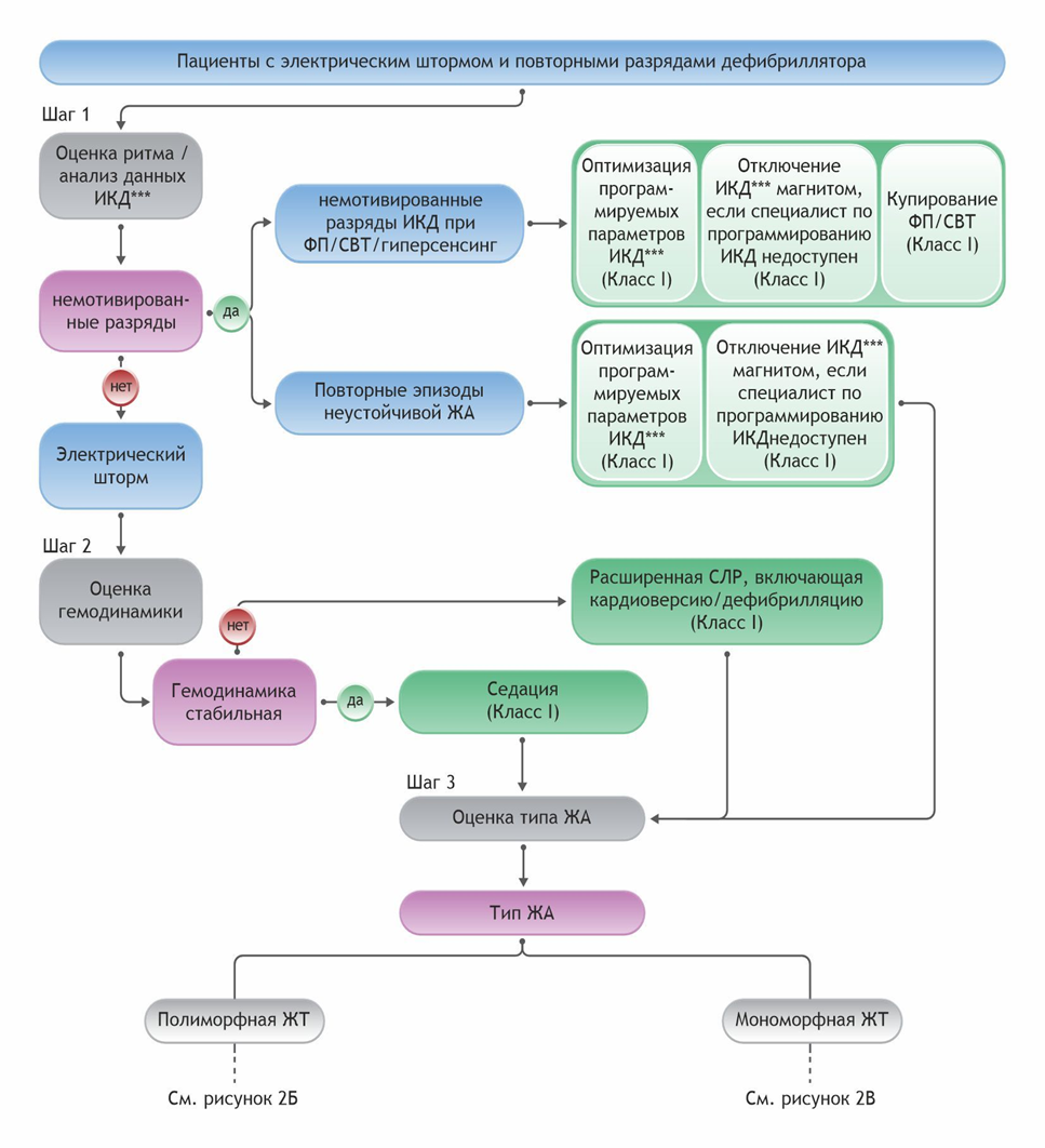 Электрический шторм – три или более эпизода ЖТ в течение 24 ч, при интервале времени между эпизодами не менее 5 мин, требующих либо антитахикардической электрокардиостимуляции, либо электрической кардиоверсии/дефибрилляции.