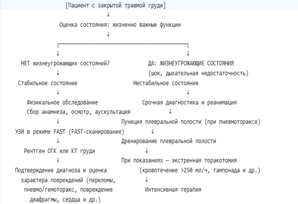 Закрытая травма груди (ЗТГ) — термин, объединяющий все повреждения в этой анатомической области без нарушения целости кожных покровов (на всю их толщину). В рамках настоящей клинической рекомендации (КР) ЗТГ включает острые повреждения грудной стенки и органов грудной полости. Не рассматриваются в данной КР осложнения и последствия ЗТГ, в частности следующие состояния: пневмония, эмпиема плевры, острый медиастинит, острый перикардит, сепсис и другие инфекционно-воспалительные осложнения ЗТГ, травматический шок, респираторный дистресс-синдром, травматическая эмболия. С очевидностью не рассматриваются в данной КР повреждения груди с нарушенной целостью кожных покровов (на всю их толщину): открытая травма груди, торакальные и торакоабдоминальные ранения.