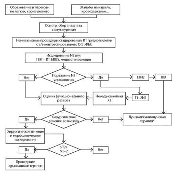 * Пациентам с I стадией НМРЛ при функциональности, высоком риске хирургических осложнений или отказе пациента от хирургического лечения рекомендуется радикальная лучевая терапия. При II стадии заболевания в случае невозможности проведения хирургического лечения рекомендуется химио-, химиолучевая, или лучевая терапия. При T1-2N0 стадии в случае невозможности проведения хирургического лечения возможно проведение стеретаксической гипофракционной радиотерапии с использованием крупных доз за фракцию (РОД 12 Гр, СОД 48-56 Гр)