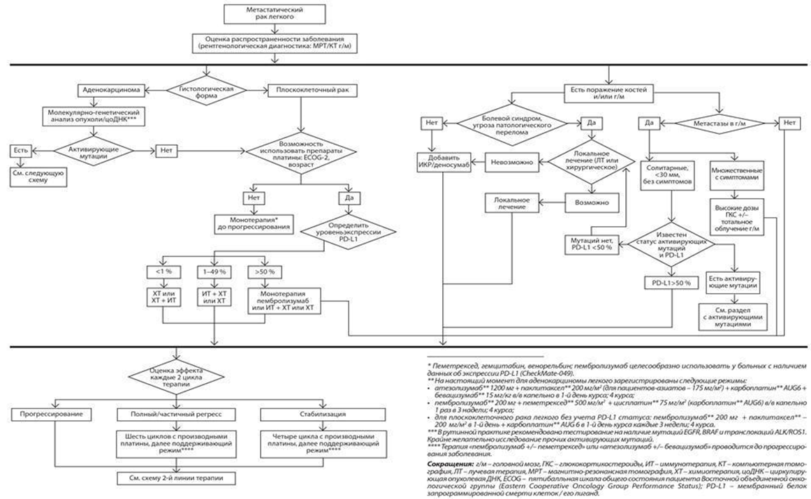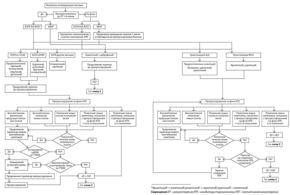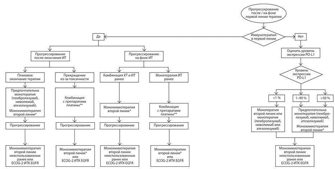 Сокращения: ХТ – химиотерапия; ИТ – иммунотерапия; PD-L1 – мембранный белок запрограммированной смерти клеток/его лиганд; ECOG – пятибалльная шкала общего состояния пациента Восточной объединенной онкологической группы (Eastern Cooperative Oncology Group Performance Status); EGFR – (epidermal growth factor receptor) рецептор эпидермального фактора роста; ИТК – ингибиторы тирозинкиназ.