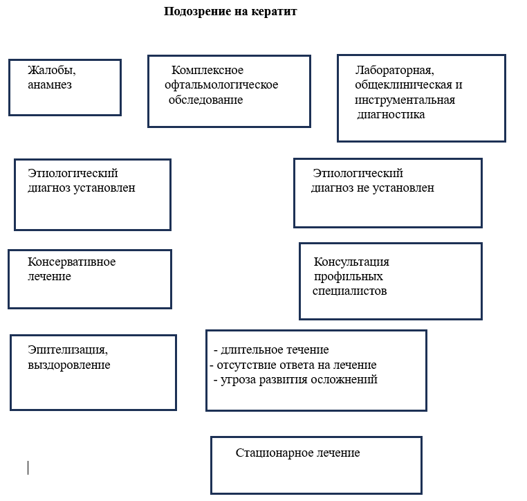 Существует множество классификаций кератитов, основанных на этиопатогенезе, степени тяжести, локализации воспалительного процесса, его глубине и протяженности, формах и фазах течения, наличии таких осложнений, как гипопион и др. [17;23;51-56]