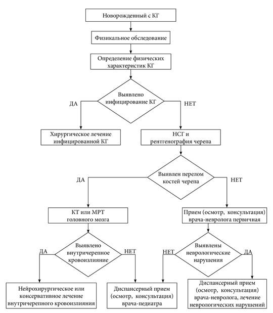 Новорожденному с КГ рекомендовано приём (осмотр, консультация) врача-педиатра первичный/повторный. Для большинства КГ характерна самостоятельная резорбция и полное разрешение в течение нескольких недель или месяцев [1, 2, 11, 13] [5–7, 19].