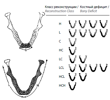 Комбинации этих обозначений возможны (например, дефект от угла до угла обозначается как LCL). С точки зрения хирургической тактики такое деление позволяет точно определить количество необходимых остеотомий.