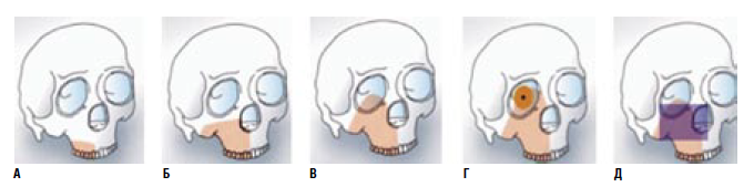 Рисунок 3. Классификация дефектов верхней челюсти, предложенная в 2010 г. Z. Durrani и соавт. (адаптировано из [14]): а – альвеоэктомия, б, в, г, д – максиллэктомия субтотальная, тотальная, радикальная, сочетанная соответственно.