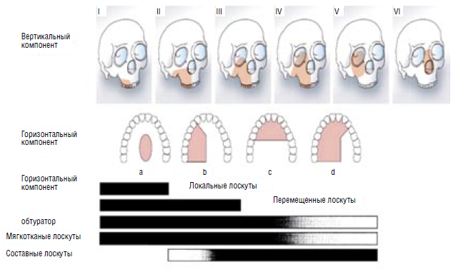 В настоящее время наиболее распространенной при оценке дефектов верхней челюсти является классификации J. S. Brown и R. J. Shaw (2010) (Рисунок 2), в которой, кроме дефекта костных структур, дополнительно учитывают все его составляющие: покровные ткани, ротоглотку, основание черепа, твёрдую мозговую оболочку. Предложены следующие символы для обозначения дефектов: