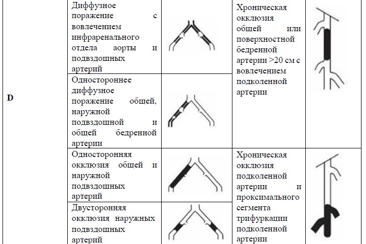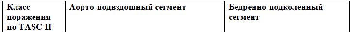 Содержание (шаблон): Таблица классифицирующая и отражающая анатомическую локализацию поражения артерий нижних конечностей по степени, протяженности и сочетанного характера поражения артерий нижних конечностей.