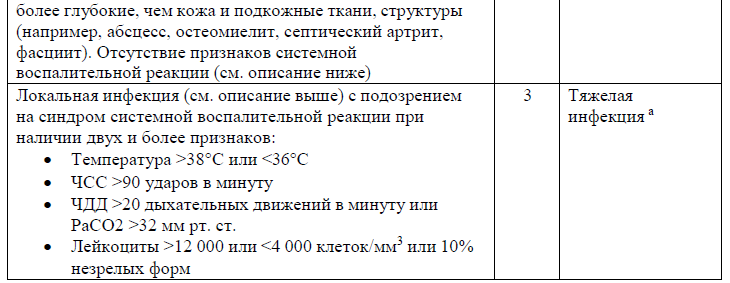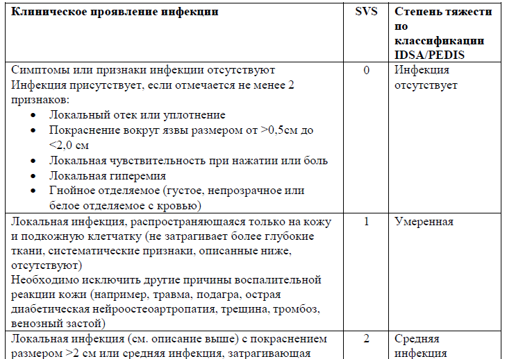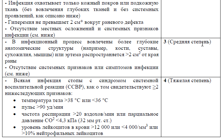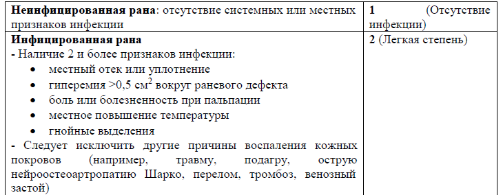 Содержание (шаблон): Таблица классифицирующая и отражающая оценку степени тяжести раневой инфекции при диабетической стопе.