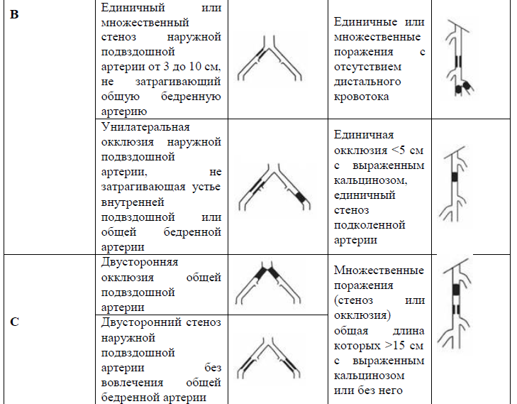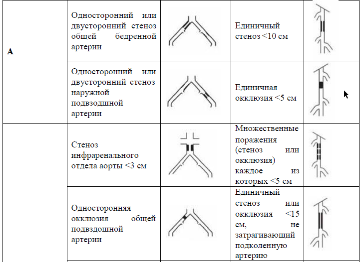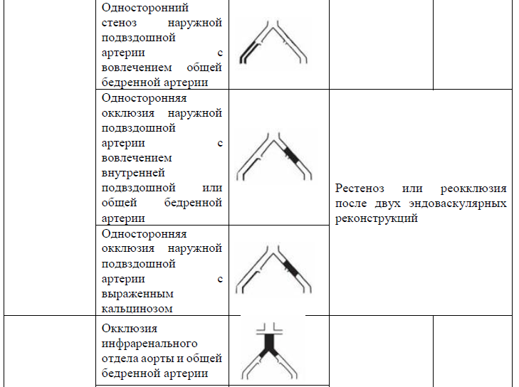 наружной подвздошной артерии (но не одновременно), стеноз инфраренального отдела аорты; любая комбинация этих состояний.