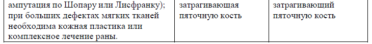 Пояснения: В зависимости от степени выраженности трофических нарушений и тяжести имеющихся инфекционных и воспалительных процессов в ране определяются показания к хирургической обработке раны или инфицированной ткани (при легкой и средней степени инфицированности) или ампутации нижних конечностей (при тяжелой степени инфекции стопы).