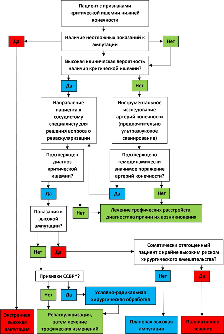 Для количественной оценки риска высокой ампутации (ампутация нижней конечности) и срочности реваскуляризации конечности (переключение магистральных артерий) может использоваться классификация WIfI (см. приложение Г4). В практическом отношении ее использование позволяет выработать диверсифицированный подход к маршрутизации больных КИНК в ситуациях, когда подобный подход может быть реализован.