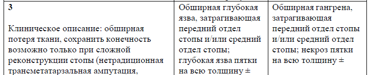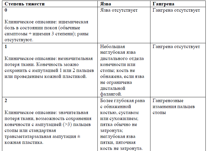 Содержание (шаблон): Таблица классифицирующая и отражающая оценку степени тяжести раны, ишемии нижних конечностей и тяжести инфекционного процесса в мягких тканях и костях нижних конечностей.
