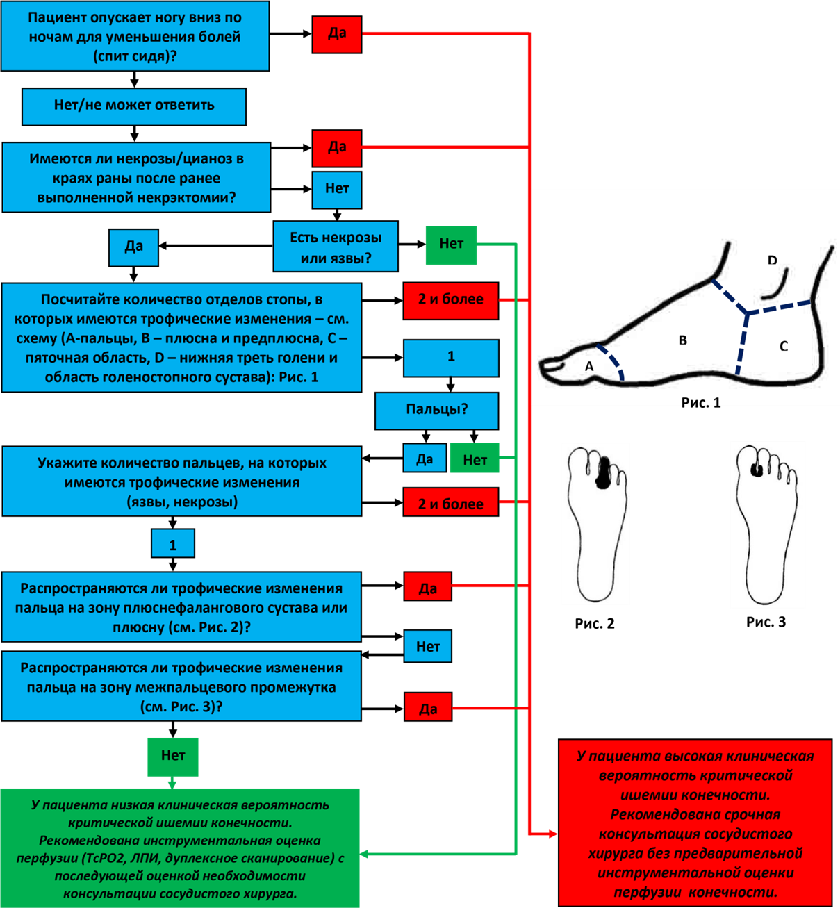 Комментарии: подтвердить диагноз КИНК в сомнительных случаях помогает измерение пальцевого артериального давления (ПАД, измерение артериального давления на периферических артериях) и транскутанная оксиметрия (ТКО, определение парциального давления кислорода в мягких тканях (оксиметрия)) [27]. При этом признаками ишемического характера болей считают уровень ПАД ниже 30 мм рт. ст. и чрескожного напряжения кислорода (ЧНК) также менее 30 мм рт. ст. [3]. При КИНК с трофическими изменениями даже более высокие показатели ЛАД, ПАД и ЧНК не исключают наличие угрозы потери конечности [10].