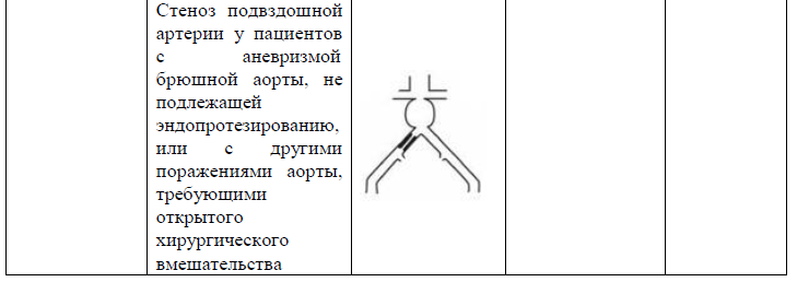 Окклюзия аорты; окклюзия общей и наружной подвздошной артерии; тяжелое диффузное поражение и/или малый диаметр (<6 мм) общей и наружной