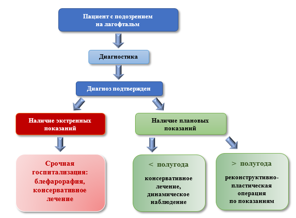 • Рекомендуется прием (осмотр, консультация) врача-офтальмолога повторный (B01.029.002) детей и взрослых с лагофтальмом с целью оценки риска осложнений со стороны органа зрения и решения вопроса о хирургическом лечении лагофтальма [1].