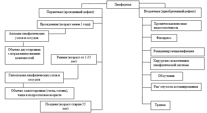 По классификации лимфедема делится на первичную и вторичную, которые отличаются причинами развития отека [24].