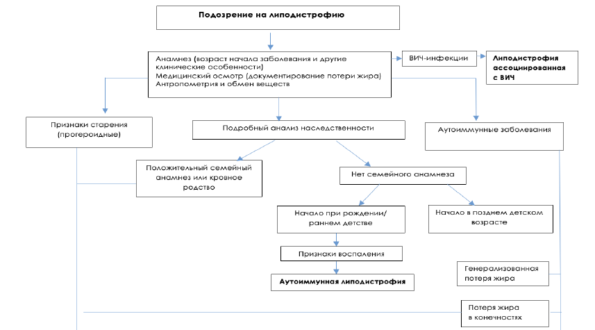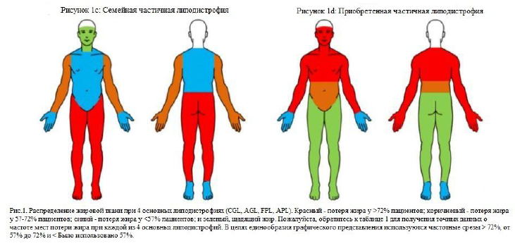 Синдромы липодистрофии – это гетерогенная группа очень редких заболеваний, характеризующихся полной или частичной потерей подкожной жировой клетчатки, часто сопровождающихся различными метаболическими нарушениями: инсулинорезистентностью и сахарным диабетом, жировым гепатозом и стеатогепатитом, дислипидемией, артериальной гипертензией[1,2,4,5,6,7].