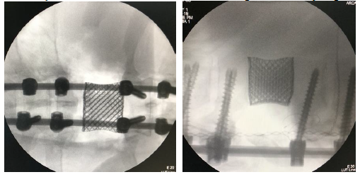 В ножки дуг выше- и нижерасположенных позвонков под контролем ЭОП вводятся винты, устанавливаются продольные балки. Производится компрессия за выше- и нижележащие винты, что позволяет произвести коррекцию кифотической деформации. Производится закрепление конструкции гайками и поперечным коннектором. Всем пациентам проводился рентген-контроль во время операции, после установки импланта и задней транспедикулярной фиксации (рисунок 6).
