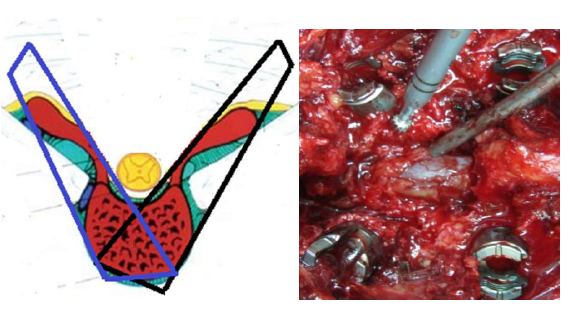 Рисунок 2. Справа схематическое изображение резекции тела позвоночника путем высверливания транспедикулярным доступом. Слева интраоперационное изображение.