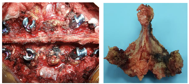 Рисунок 4. Интраоперационное фото: завершающий этап удаления тела позвонка после его окончательной мобилизации (слева) и пораженный опухоль позвонок «в сборе», после тотальной блок-резекции (справа).