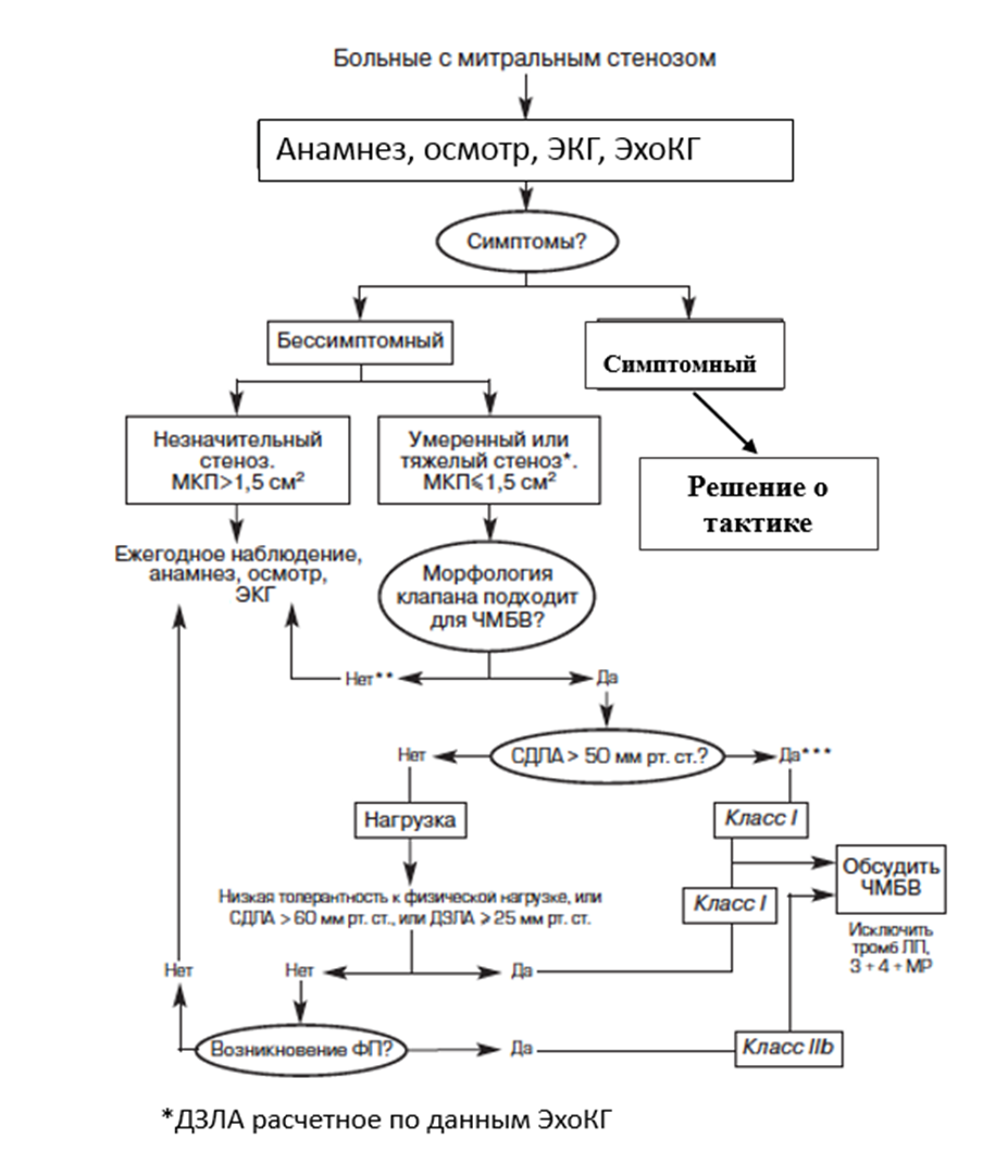 Комментарии: на начальных стадиях пациенты могут не предъявлять жалоб, при прогрессировании МС появляются жалобы на одышку сначала при физической нагрузке, далее в покое, одышка приобретает черты ортопноэ, на сухой кашель, приступы удушья, кровохарканье, на повышенную утомляемость, мышечную слабость, появляющуюся при физической нагрузке, сердцебиение, перебои в работе сердца, боли в области сердца, дисфагию, осиплость голоса. Жалобы на отеки, тяжесть в правом подреберье, диспепсические расстройства (анорексия, тошнота, рвота) характерны для поздних стадий заболевания. МС может манифестировать впервые возникшей фибрилляцией предсердий или тромбоэмболиями.