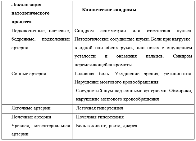 Для супрадиафрагмального поражения дуги аорты характерны симптоматика со стороны центральной нервной системы (ишемические инсульты, судороги), боли в грудной клетке, сердцебиения, признаки сердечной недостаточности, синкопальные состояния, артериальная гипертензия, перемежающаяся хромота. Изолированное поражение дуги арты развивается редко, примерно у 10% пациентов. У 2/3 больных развивается сочетанное супра- и инфрадиафрагмальное поражение аорты и отходящих от нее артерий. Для инфрадиафрагмального поражения аорты характерны артериальная гипертензия, боли в животе. При поражении почечных артерий единственным симптомом заболевания у 66-93% пациентов является почечная гипертензия, которая может сочетаться с шумами над сосудами при аускультации. Для поражения мезентериальных артерий характерны гемoколит и выраженные боли в животе. Системные проявления – потеря массы тела, лихорадка, слабость развиваются у 26-86%; артрит, артралгии и миалгии - у 65% больных. Может встречаться перемежающаяся хромота – у 11-47% пациентов.