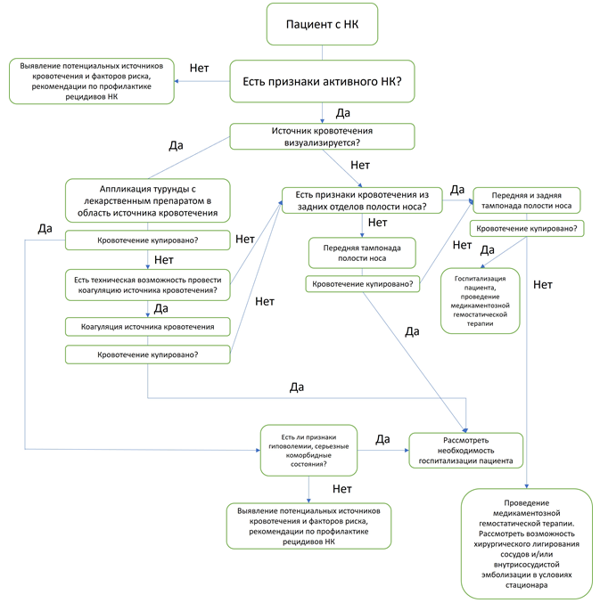 Комментарии: пациент с активным НК может обратиться первично к любому медицинскому специалисту, включая врачей и фельдшеров бригад скорой медицинской помощи. В случае необходимости госпитализации пациента с НК следует выбирать стационар с наличием дежурного врача-оториноларинголога, который может провести инструментальное обследование пациента и оказать специализированную помощь. В случае если в момент активного НК проведение осмотра врачом-оториноларингологом не было возможно, в том числе если НК купировалось самостоятельно, необходимо направить пациента на осмотр врачом-оториноларингологом в плановом порядке [8].