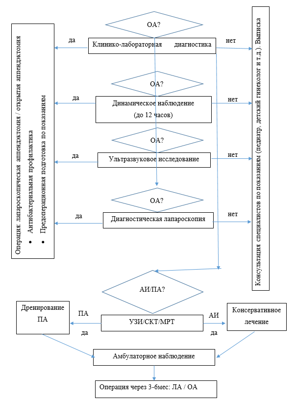 Примечание: ОА – острый аппендицит, АИ – аппендикулярный инфильтрат; ПА – периаппендикулярный абсцесс;