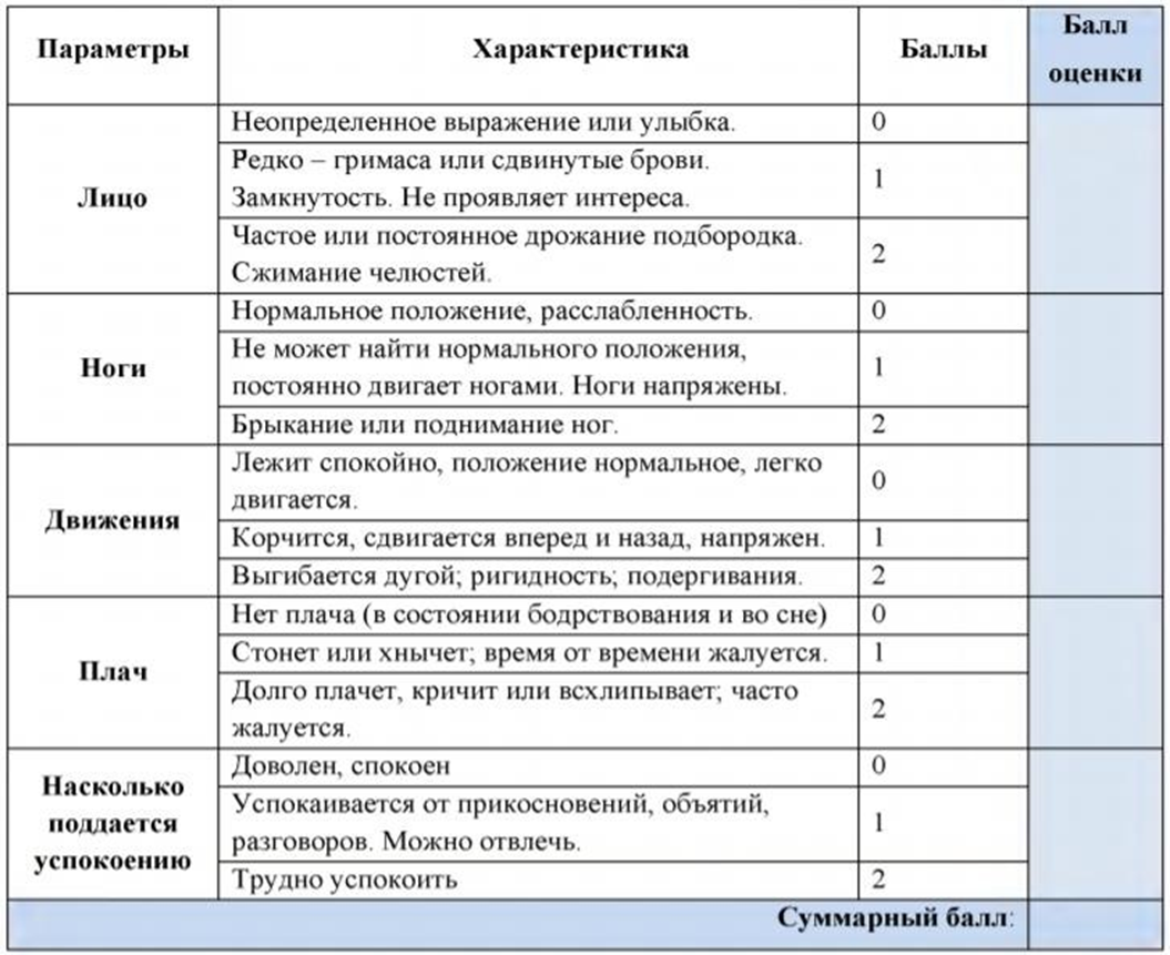 Содержание (шаблон): шкала учитывает выражение лица, движения ног, характер крика, а также насколько ребенок поддается успокаиванию, и особенности его поведения. Общая оценка по шкале FLACC равна сумме баллов по всем пунктам описания.