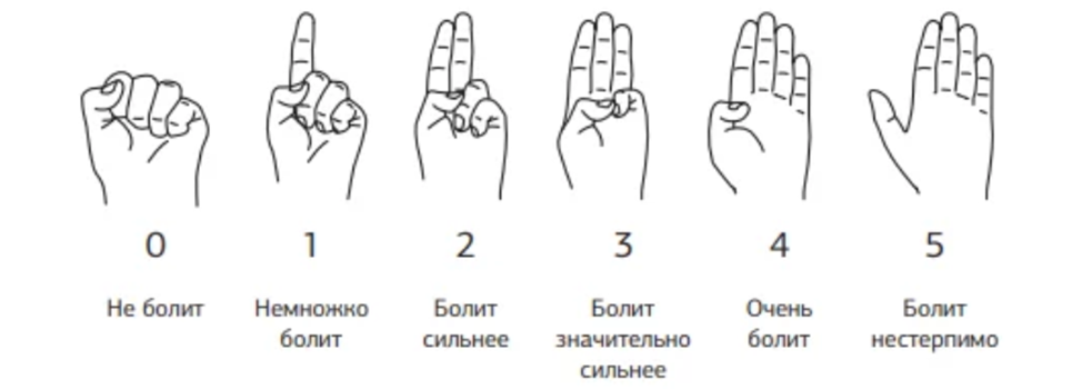 Содержание (шаблон): Показывает колебания боли от отсутствия (сжатая в кулак рука) до очень сильной боли (полностью разжатая рука).