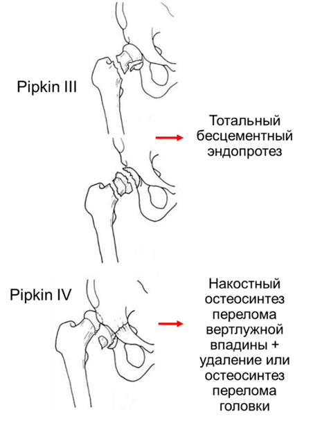 Рис. 1 Классификация переломов головки бедренной кости Pipkin.