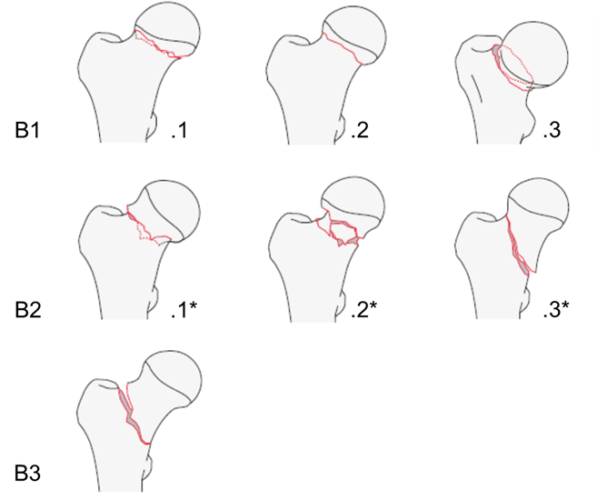 Согласно классификации АО/OTA, переломы ШБК имеют кодировку 31В и разделены на 3 типа - В1, В2, В3, которые, в свою очередь, в зависимости от тяжести перелома, подразделяются на 3 подгруппы (рис. 4) [129].