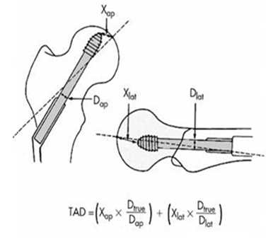 Высота (толщина) латеральной стенки (d) определяется в мм длиной линии, идущей вверх под углом 135° к линии перелома от точки, расположенной 3 см дистальнее безымянного бугорка большого вертела (Рис. 6).