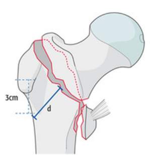 К подвертельным относятся переломы, локализующиеся в области между малым вертелом и линией, расположенной на 5 см ниже малого вертела, кодируются они по классификации АО/OTA как 32A/B/C (1-3).1 [129].