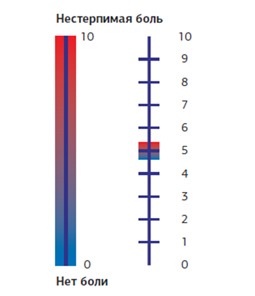 Ключ (интерпретация): нет боли – 0 баллов (0–4 мм), слабая боль - 1-4 балла (5–44 мм), умеренная боль - 5-7 баллов (45–74 мм), сильная боль - более 7 баллов (75–100 мм).