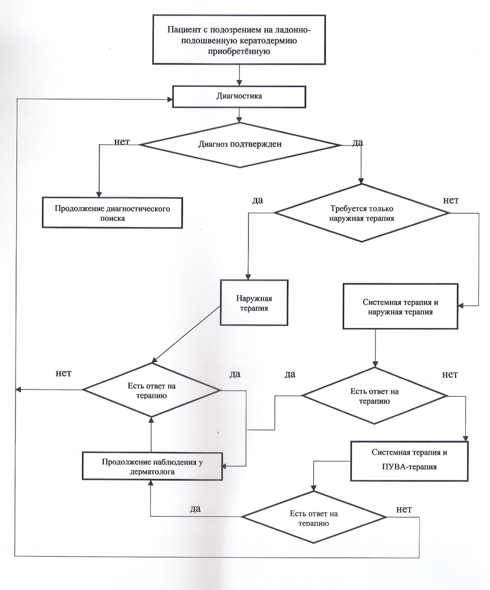 Для лечения пациентов с первичными и идиопатическими ЛПКП используется наружная и системная лекарственная терапия, а также фототерапия. Выбор терапии больных ЛПКП определяется тяжестью клинических проявлений дерматоза и субъективных ощущений (зуда), осуществляется симптоматически, и может изменяться в случае ее недостаточной эффективности. Терапия должна быть направлена на разрешение/уменьшение выраженности высыпаний: на купирование воспаления, гиперкератоза, шелушения, склонности к экссудации, на эпителизацию трещин, субъективных ощущений. Для достижения успешного результата терапии необходима диагностика и лечение возможной основной этиологической причины ЛПКП и коморбидного фона с применением поэтапного междисциплинарного подхода. Паранеопластические кератодермии обычно рефрактерны к местному лечению и могут дать ответ только при успешном лечении основного новообразования.