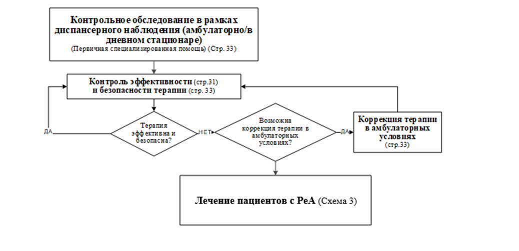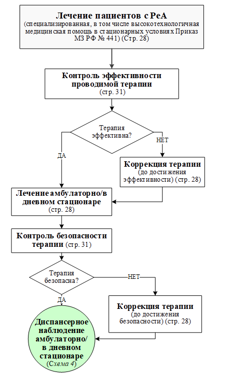 Рекомендуется проведение диагностики, в том числе дифференциальной диагностики, в условиях ревматологического стационара/дневного стационара/в амбулаторно-поликлинических условиях всем пациентам с подозрением на РеА с целью его подтверждения/исключения [1,2]. (УДД 5, УУР С)